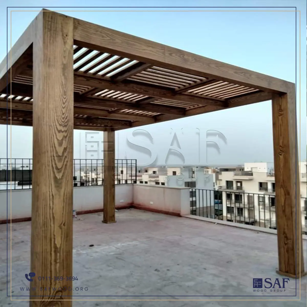 The pergola is constructed from robust, treated natural wood to withstand climatic changes and outdoor elements.